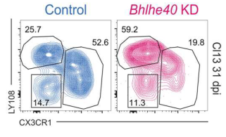 Researchers used shRNA to knock down BHLHE40 and found that PD-1, Tim3 and other IRs were down-regulated, suggesting that it may promote the expression of IRs. To test the function of BHLHE40 in regulating CD8 T cells in vivo, the researchers transferred BHLHE40 shRNA KD P14 cells into acutely and chronically infected mice and found that BHLHE40 knockdown cells in chronically infected mice had a stronger proliferation advantage. However, it was not shown in the acute model. Moreover, on d31, the expression of some IRs was reduced in BHLHE40 knockdown cells. At the same time, flow cytometry results showed that BHLHE40 knockdown promoted the differentiation of P14 cells from Tex metaphase cells to Tex progenitor cells.