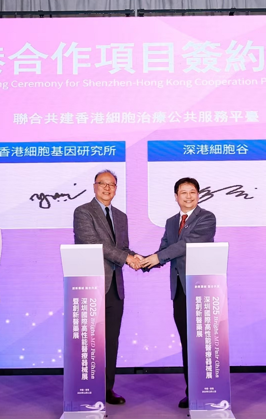 On December 11, the 2025 Shenzhen International High-Performance Medical Device and Innovative Medicine Exhibition (Hong Kong Station) was successfully held in Kowloon, Hong Kong. The event was guided by the Shenzhen Municipal Development and Reform Commission, the Health Bureau of the Hong Kong Special Administrative Region, the Health Commission of Shenzhen Municipality, and the Shenzhen Municipal Healthcare Security Administration. It was jointly organized by the Shenzhen Biomedical Promotion Association, the Shenzhen Biomedical Industry Alliance, the Shenzhen Society for Life Sciences and Biotechnology, the Hong Kong Association for Biomedical Innovation, and the Hong Kong Biotechnology Organization. Professor Shi Yuanyuan, Chairman of Cell Valley Group, was invited to attend the event, where he signed a significant strategic cooperation agreement and delivered a keynote speech.