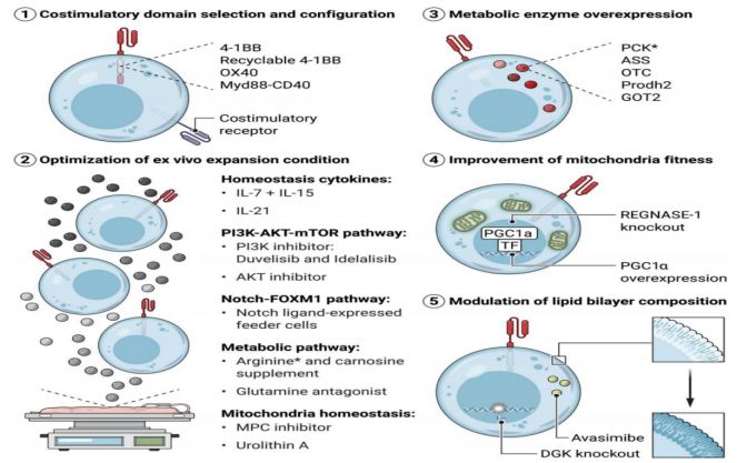 Strategies for promoting memory signatures, resisting immunosuppressive signals and depletion programs in CAR-T cells are being intensively studied. Metabolic reprogramming is a key step in the differentiation and survival of memory T cells, and metabolic insufficiency can drive the failure program of T cells during chronic viral infection and tumor invasion [10]. Therefore, in CAR-T cells, modulating metabolic fitness to promote memory T cell differentiation is considered a promising approach to improve persistence, overcome hostile TME, and maintain CAR-T cell function against chronic antigenic stimulation [9]. Studies have found that CAR-T cell persistence and effector function can be maintained in the following ways: