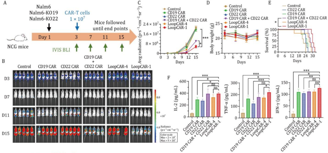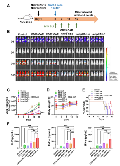 为了评估其体内的抗肿瘤效果,研究人员使用Nalm6细胞(CD19+CD22+)构建异种移植小鼠白血病模型测试各CAR-T细胞的疗效。结果显示,接受LoopCAR-1处理的小鼠体重未下降,且存活时间显著延长。此外,这些小鼠的血清细胞因子水平高于接受CD19 CAR、CD22 CAR或单靶点CAR-T联合治疗组。这些结果表明,LoopCAR-1在体内对CD19+CD22+肿瘤具有强效杀伤作用。